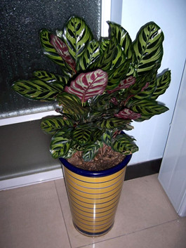 孔雀竹芋,原產于熱帶美洲及印度洋的島域中。為多年生草本,高可達60厘米,具根莖,長而窄的矛狀的葉直接從根部長出,植株呈叢狀;葉上有深淺不同的綠色斑紋,葉背部多呈褐紅色。本種葉為銀綠色,并從中脈放射出深綠色斑點,背面有同樣形狀的褐紅色斑。孔雀竹芋除甲醛的功效值為吊蘭的一半,但相比普通植物也要高很多,此外,它還是清除空氣中的氨氣污染的高手。
